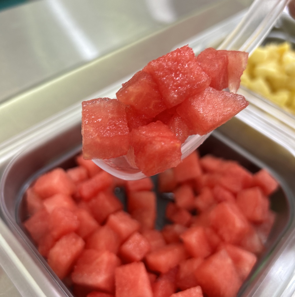 Gran variedad de saludable fruta fresca picada, como sandía, melón, mango, papaya, fresa, uvas, kiwi...